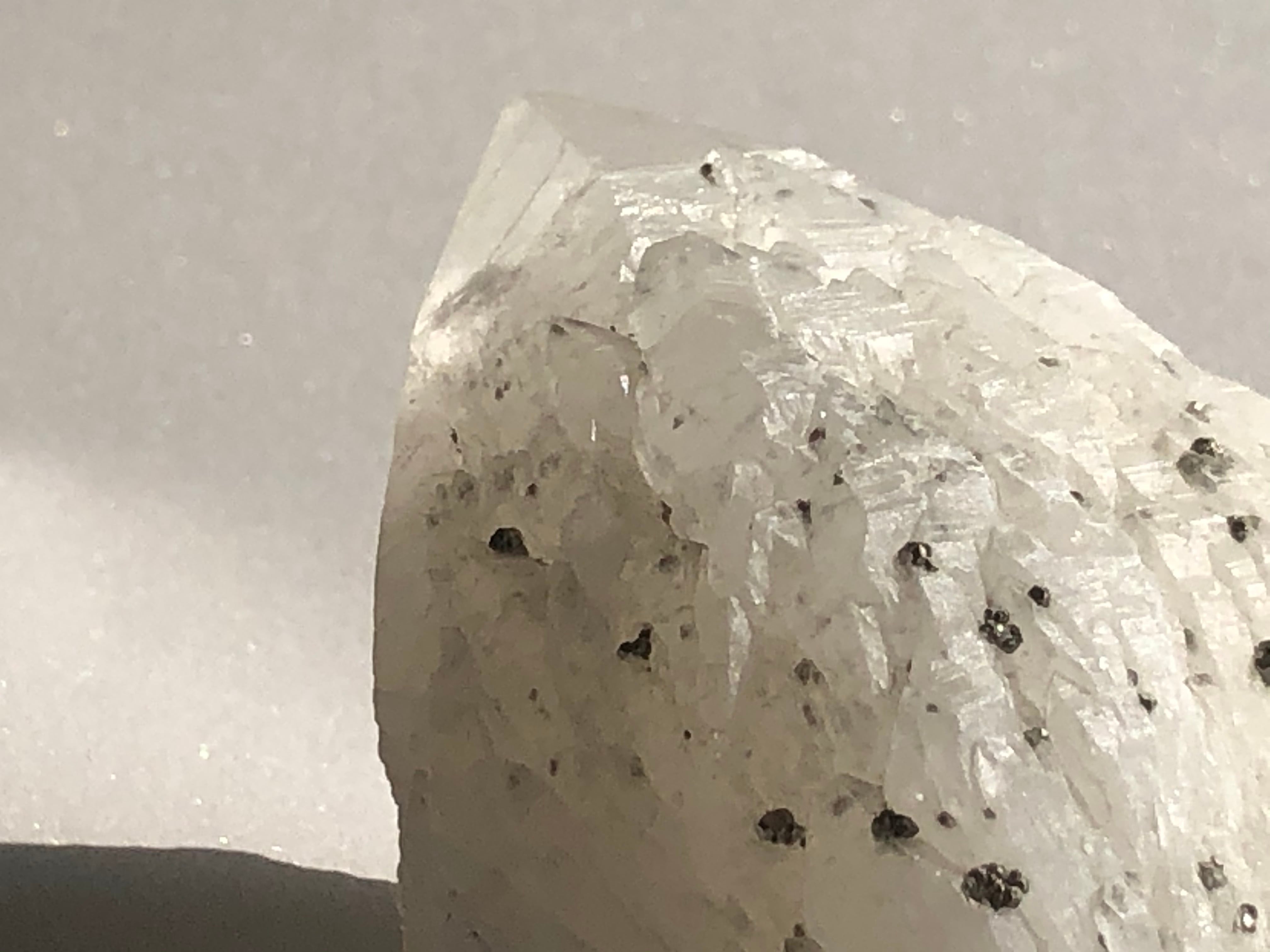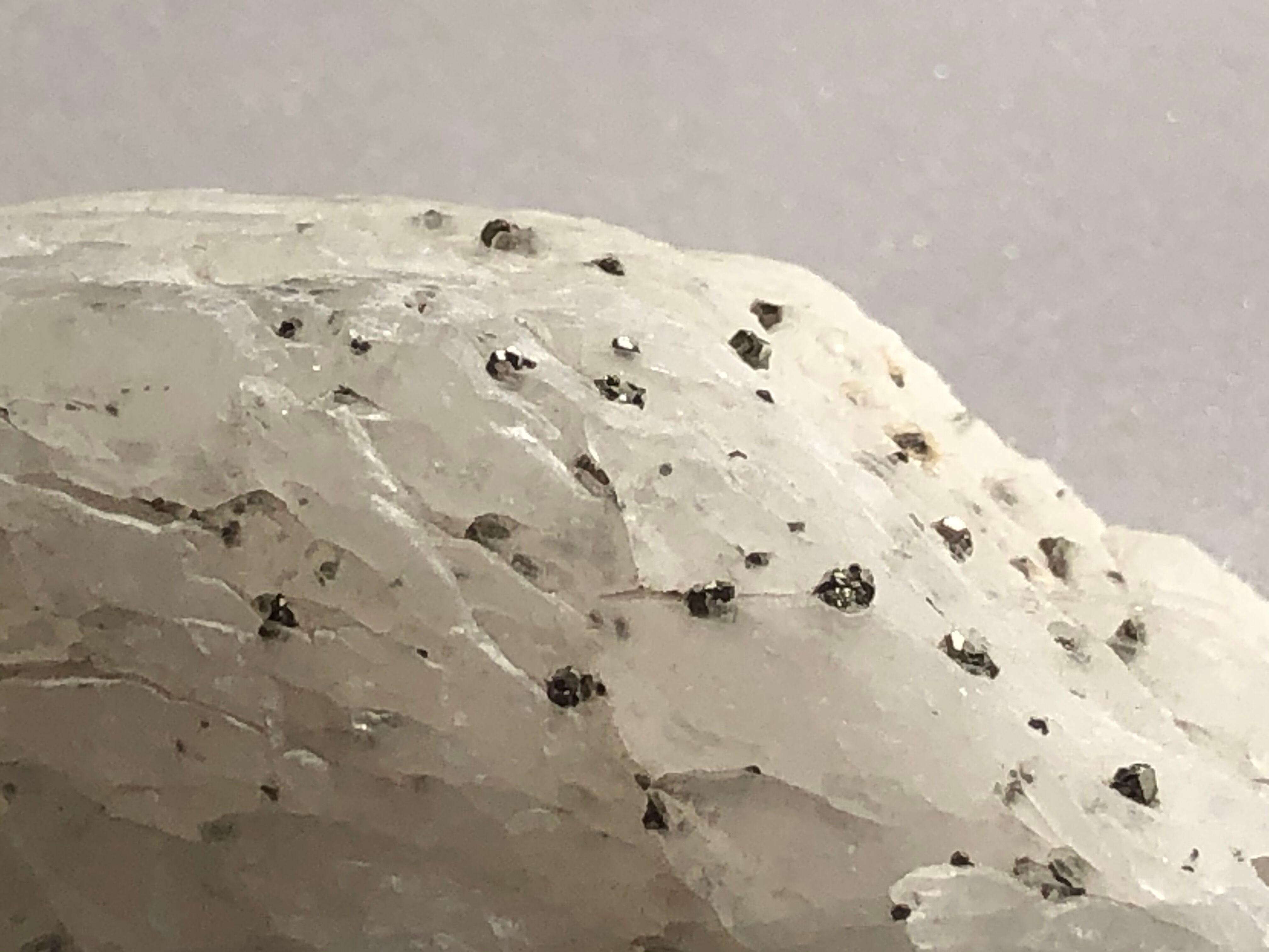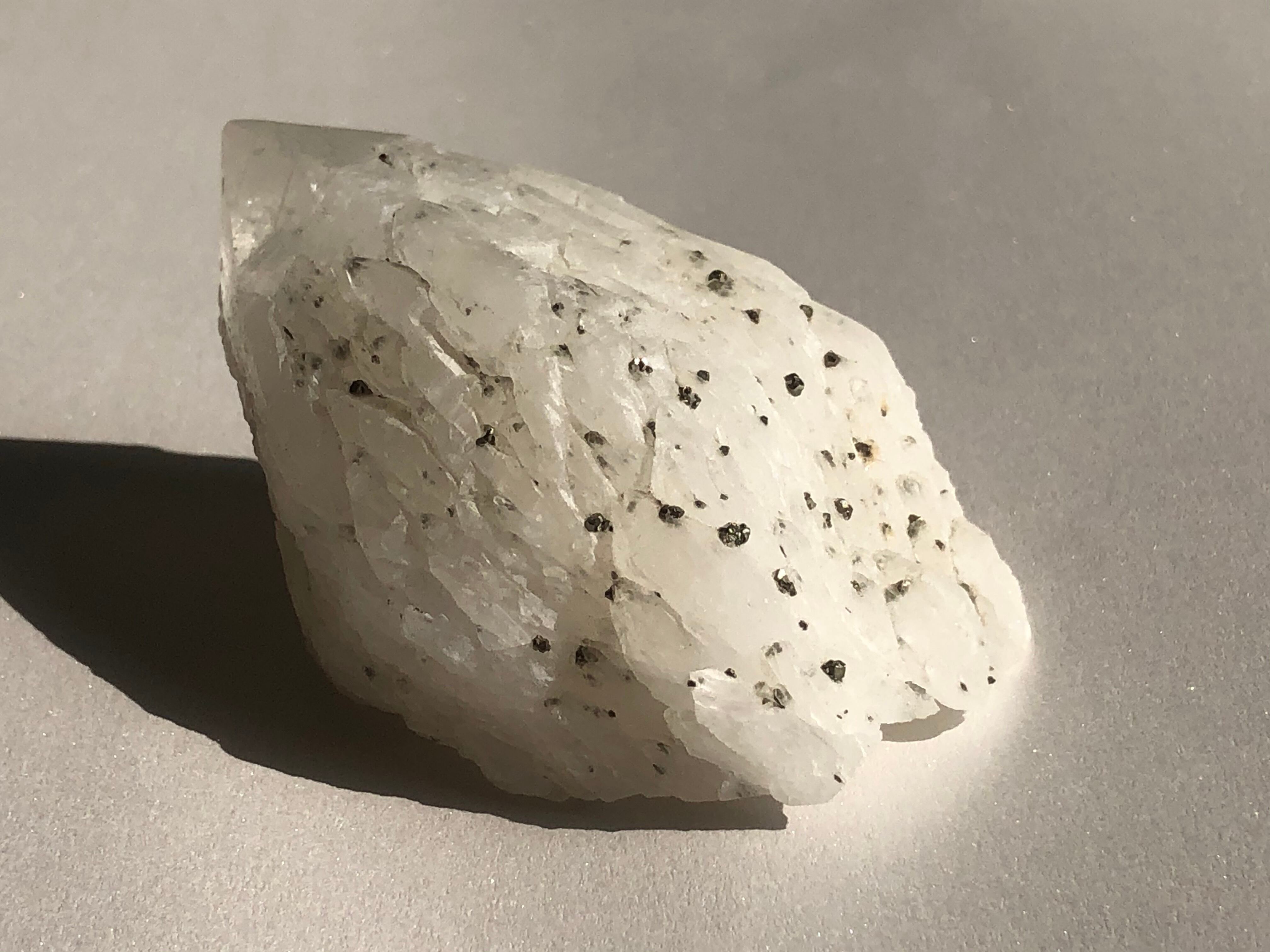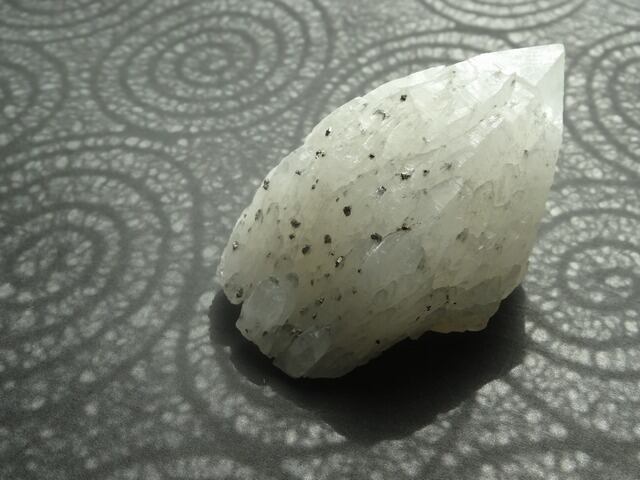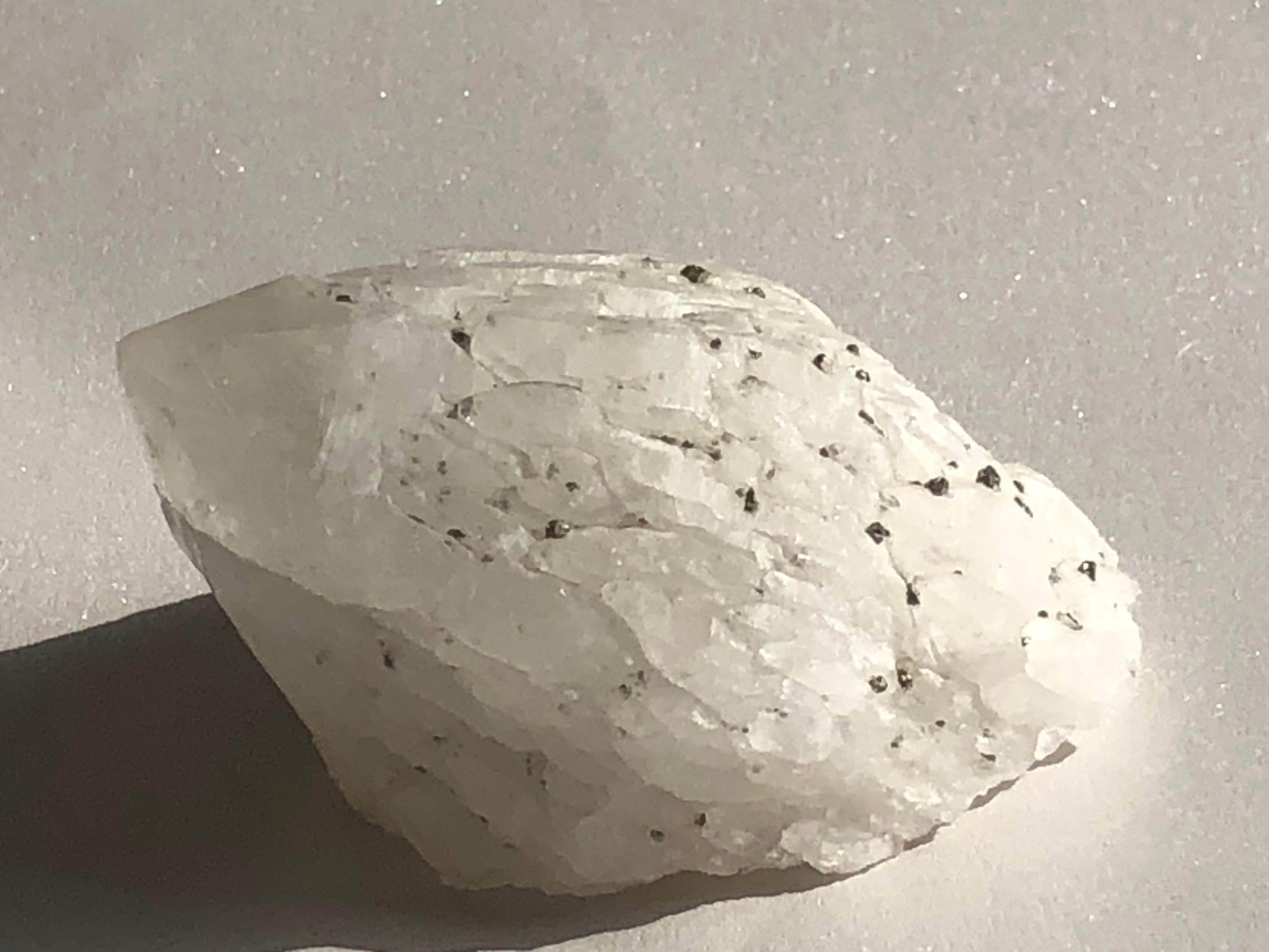 銀色に光るパイライトが表面にたくさん共生している珍しい姿です