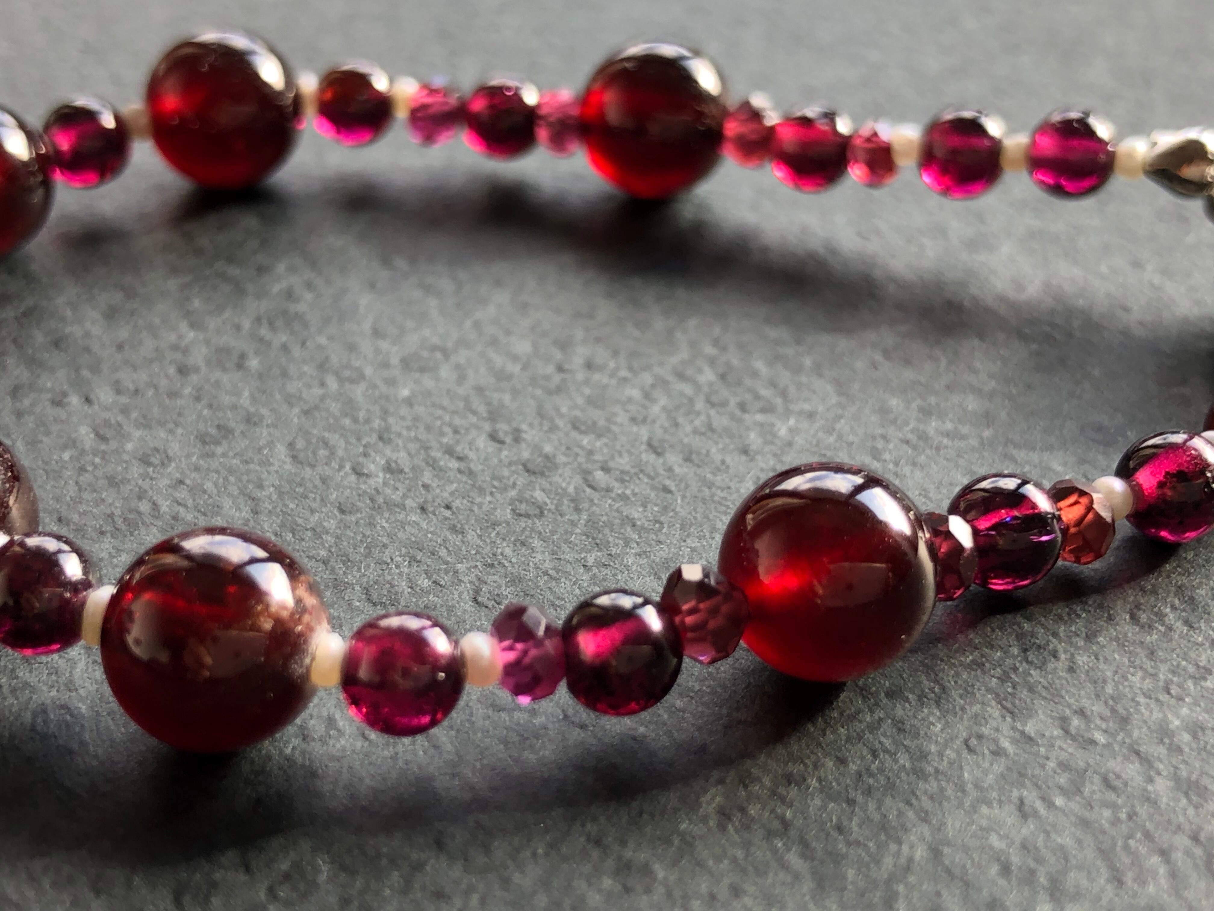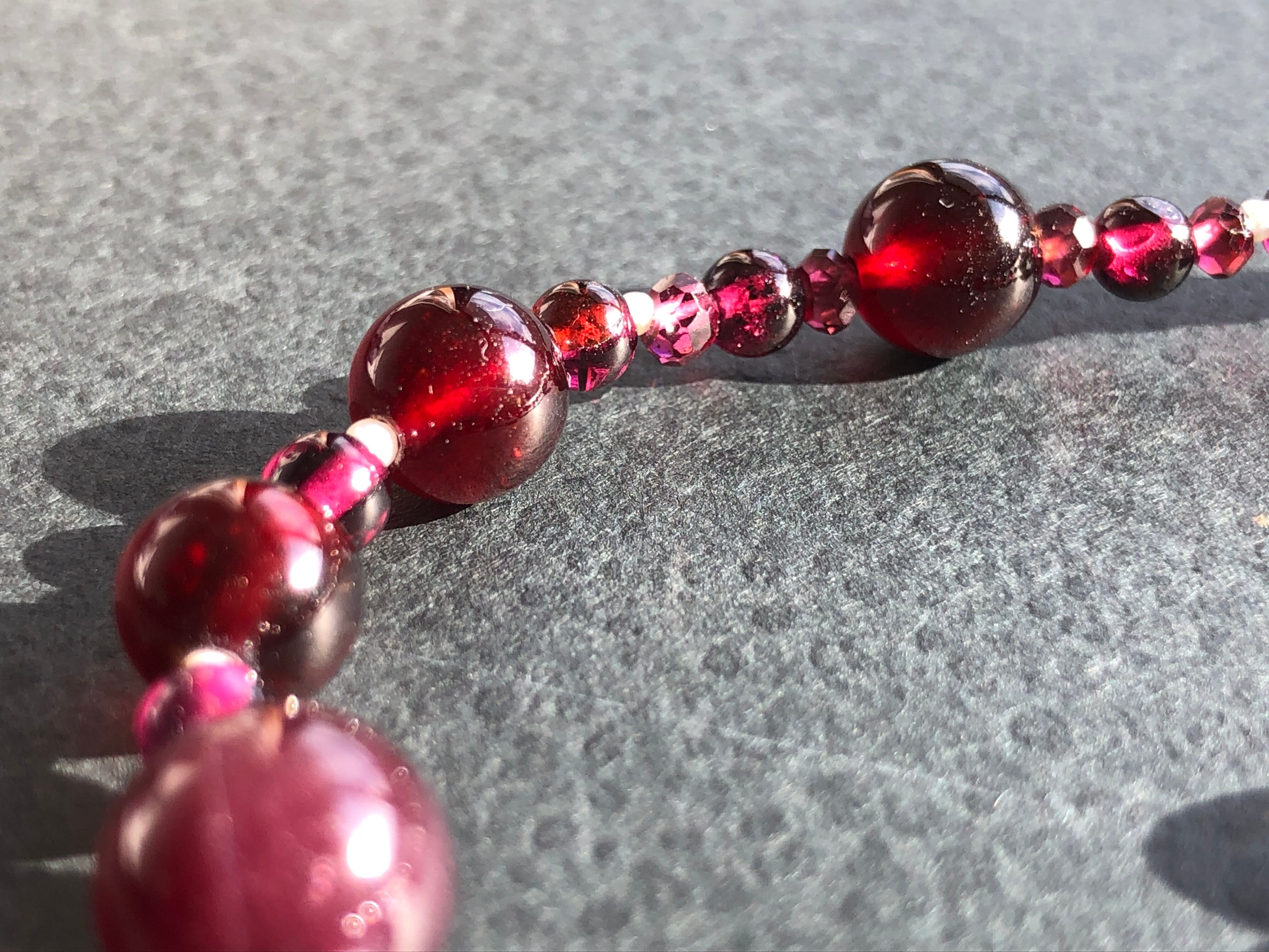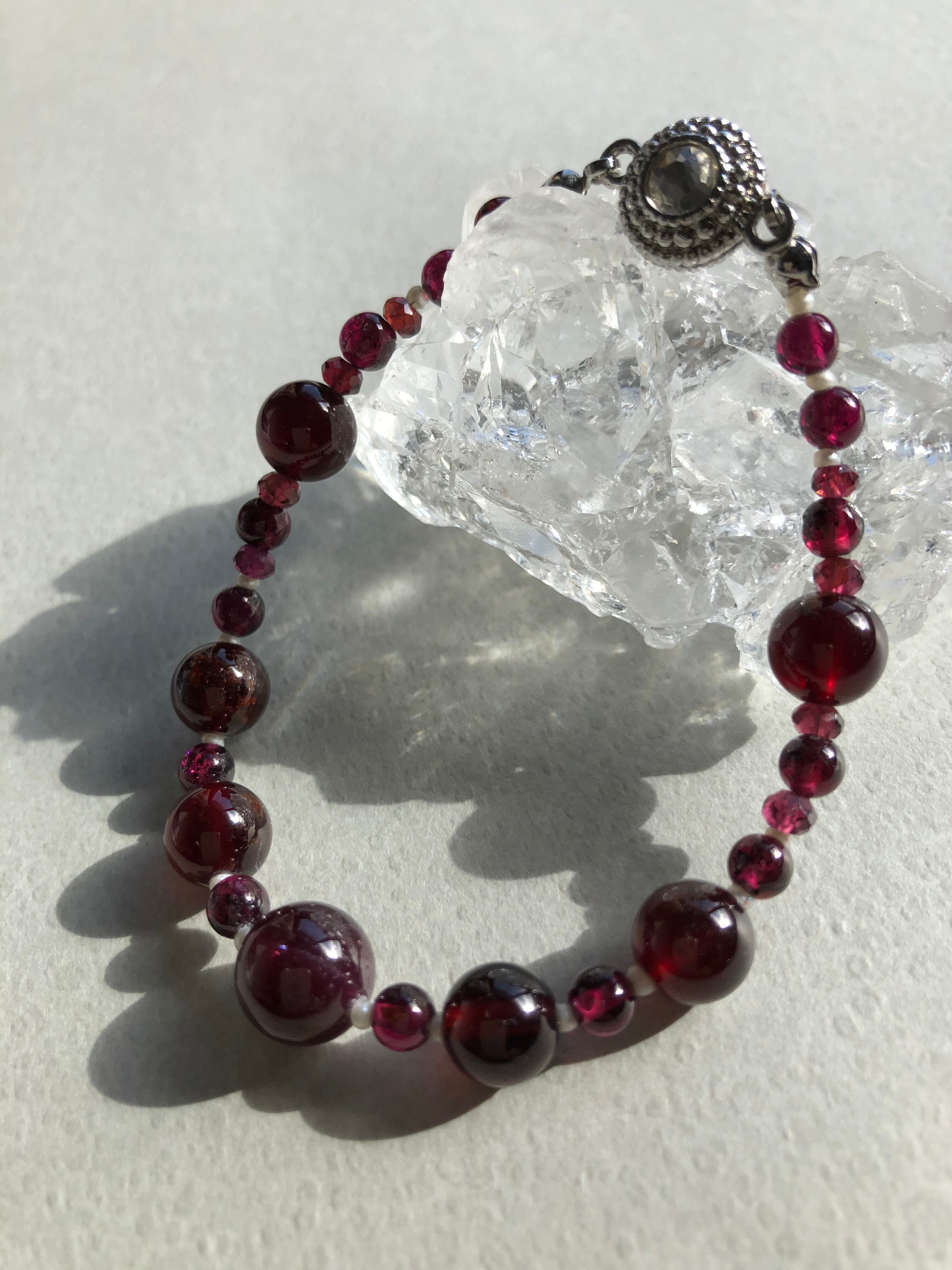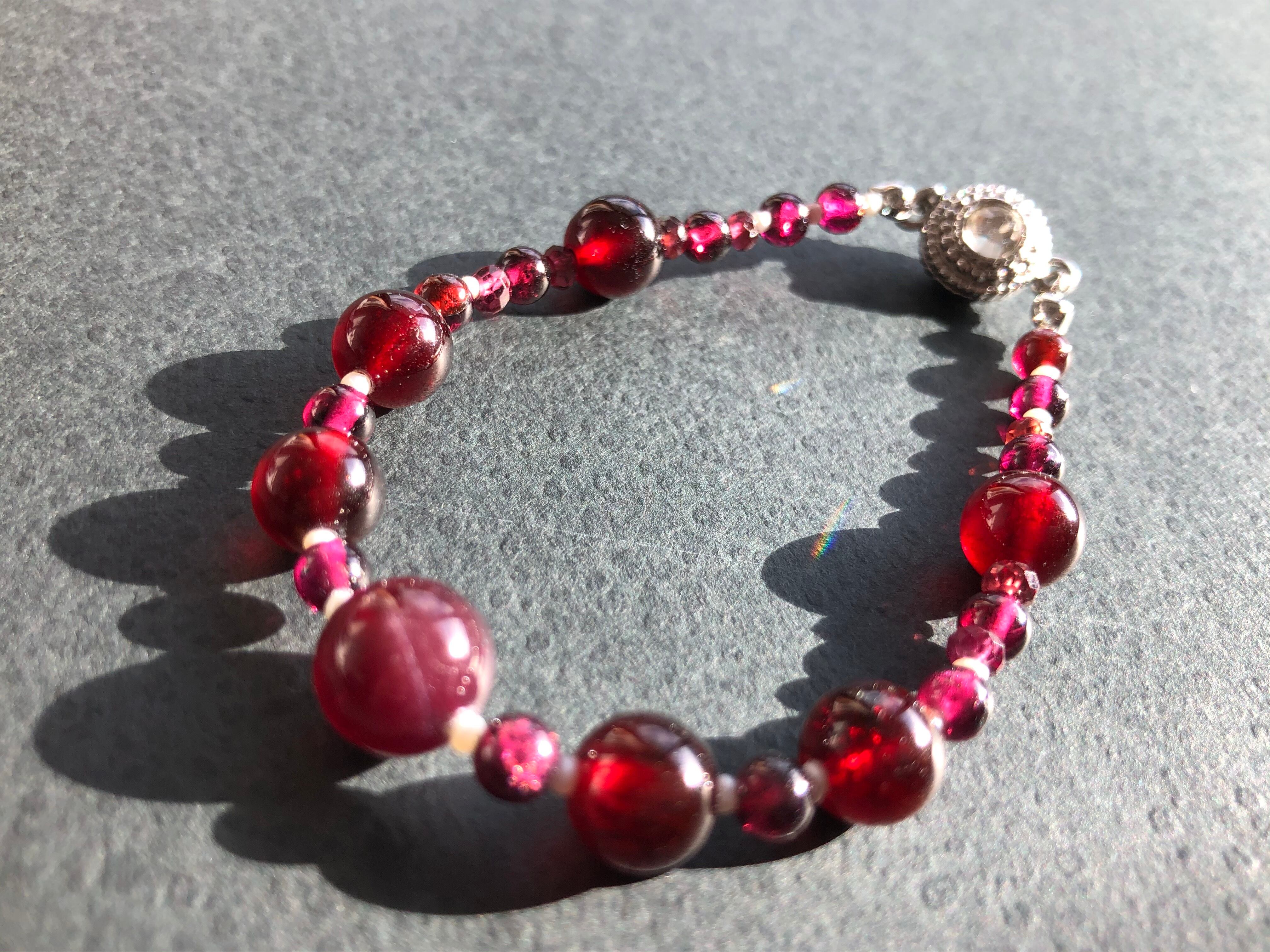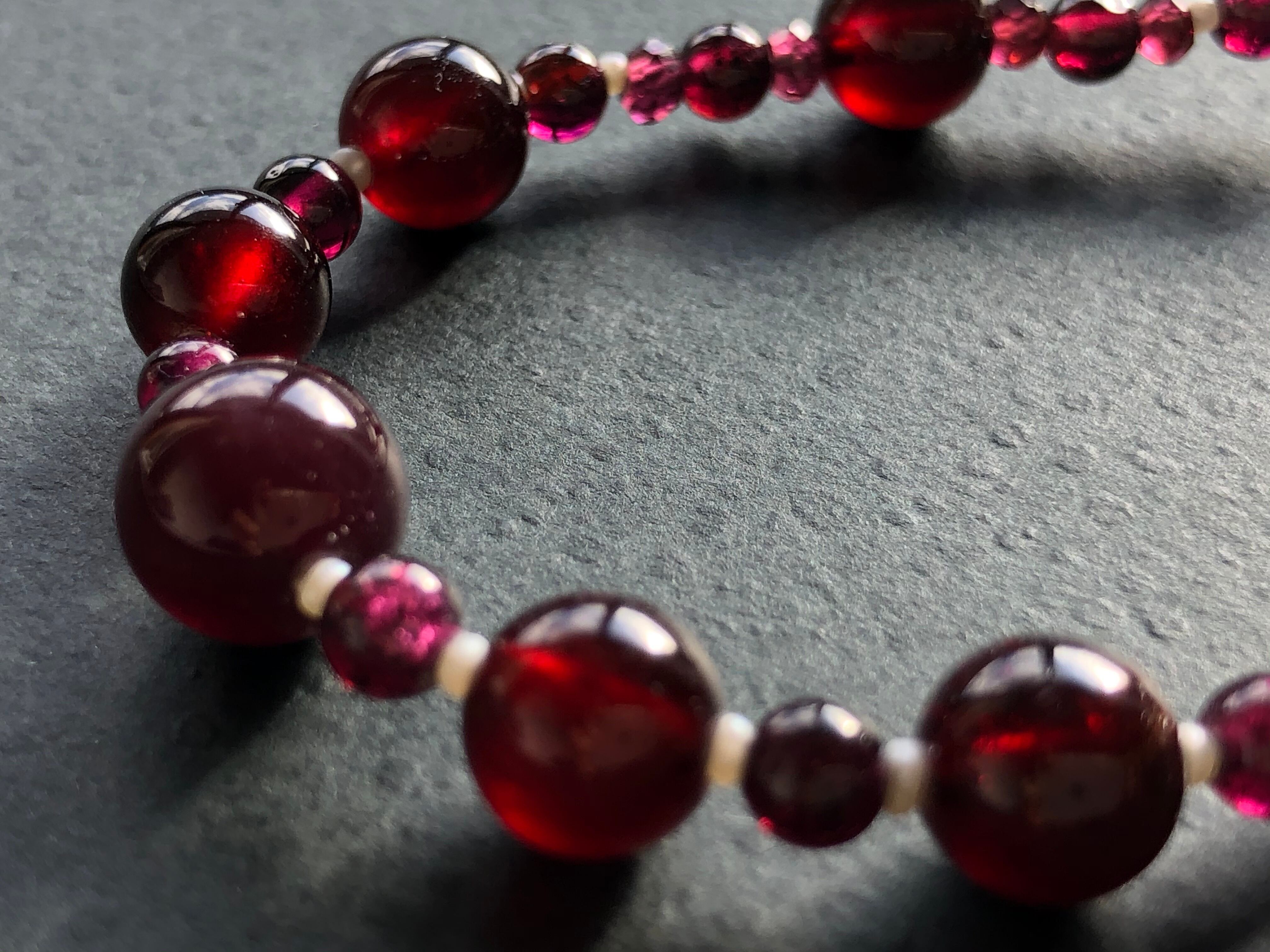 高品質なガーネットと極小の淡水パールでつなぎました