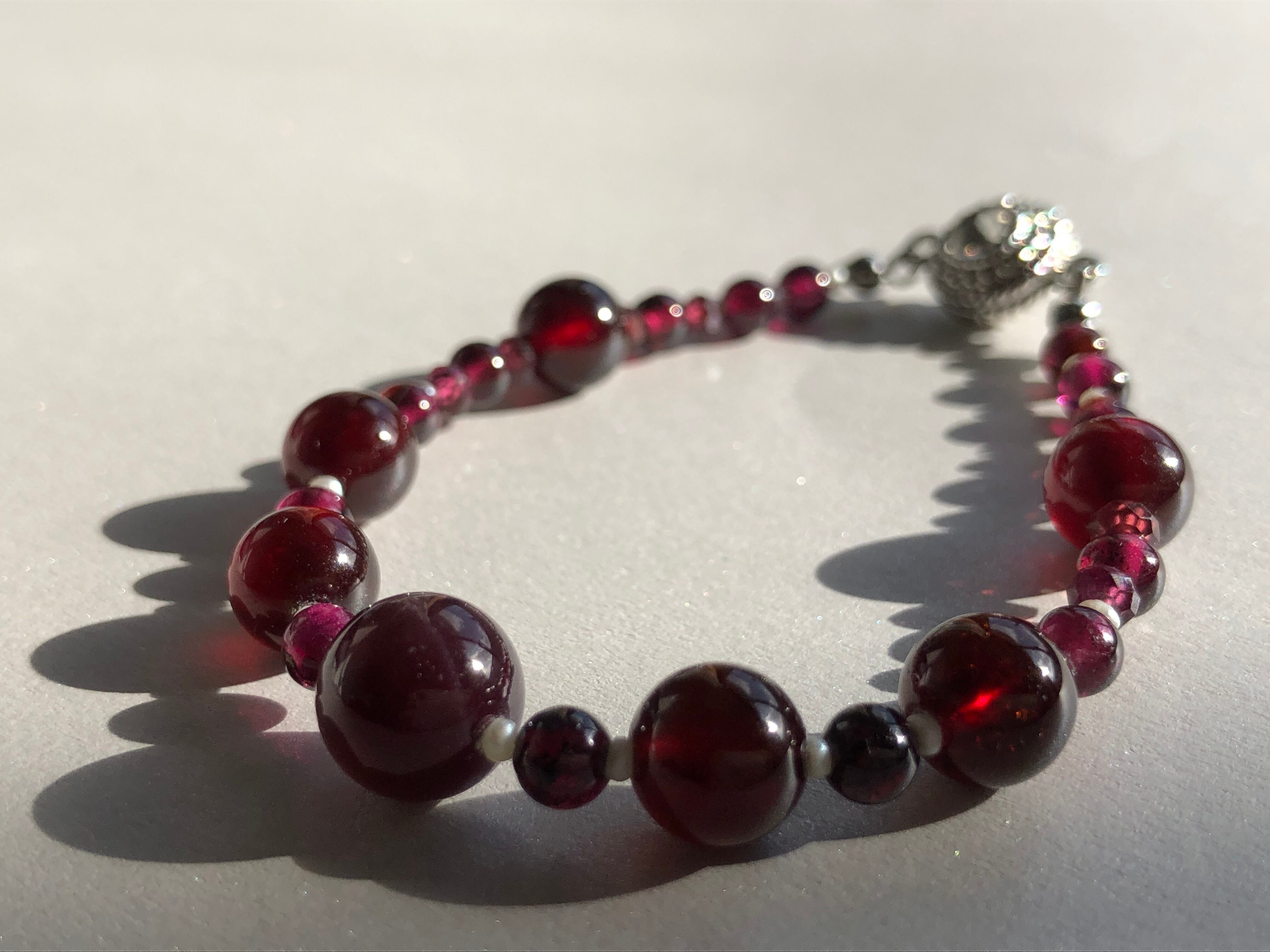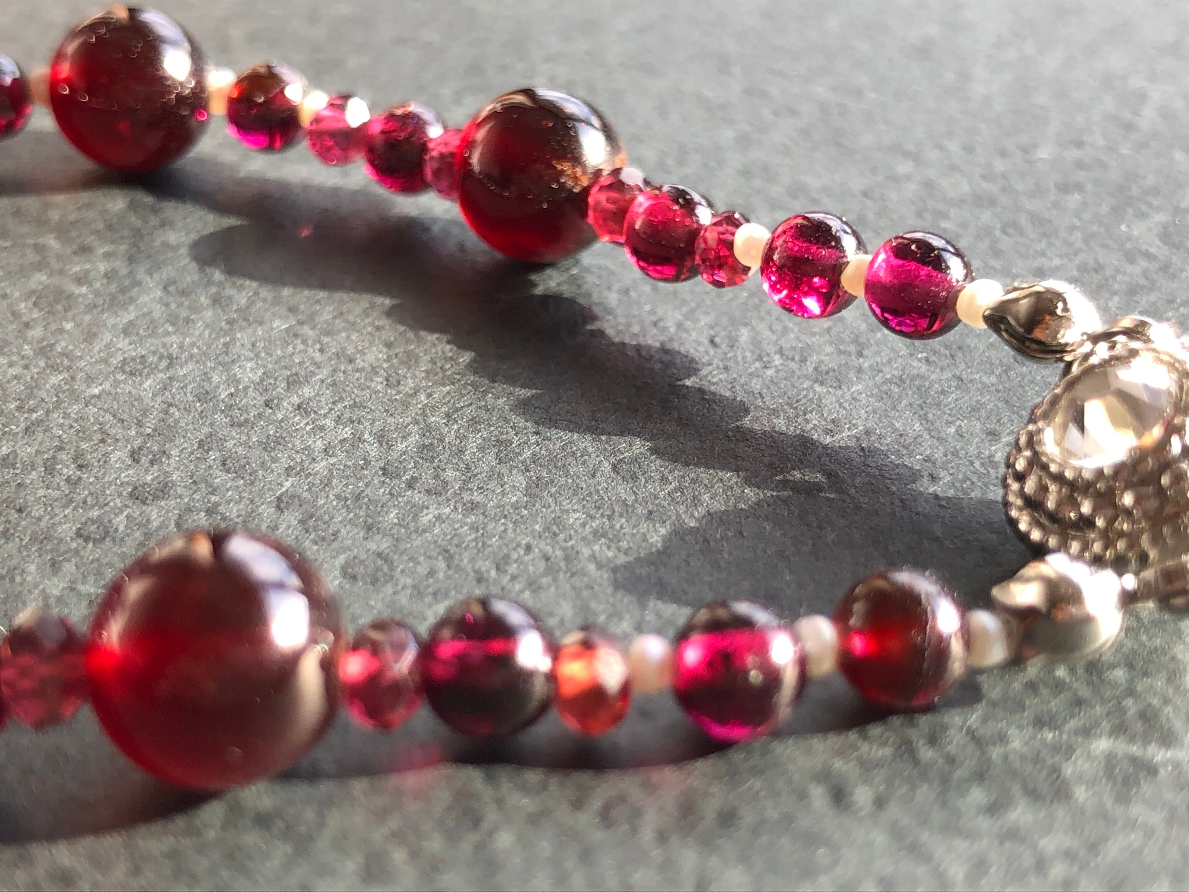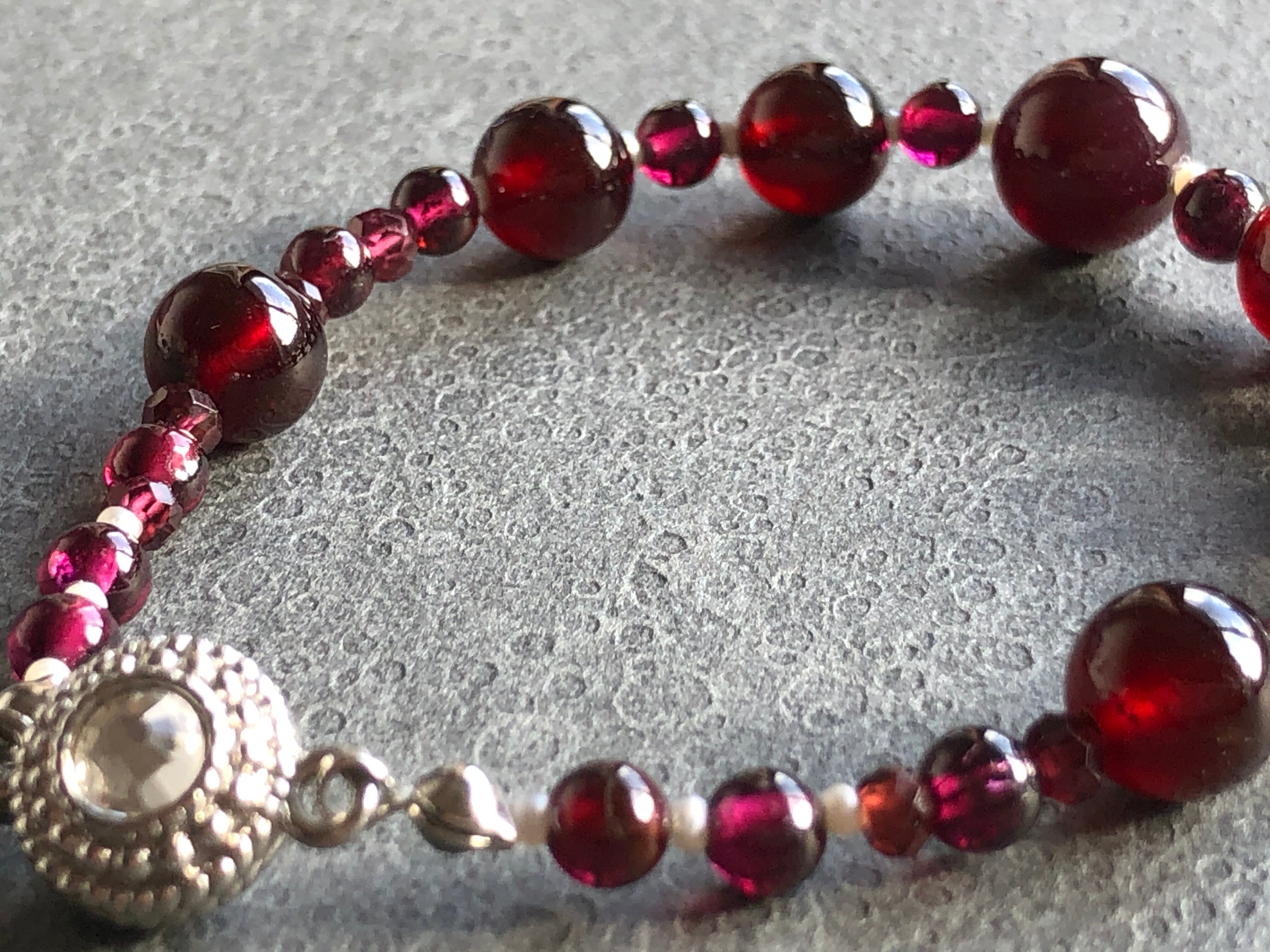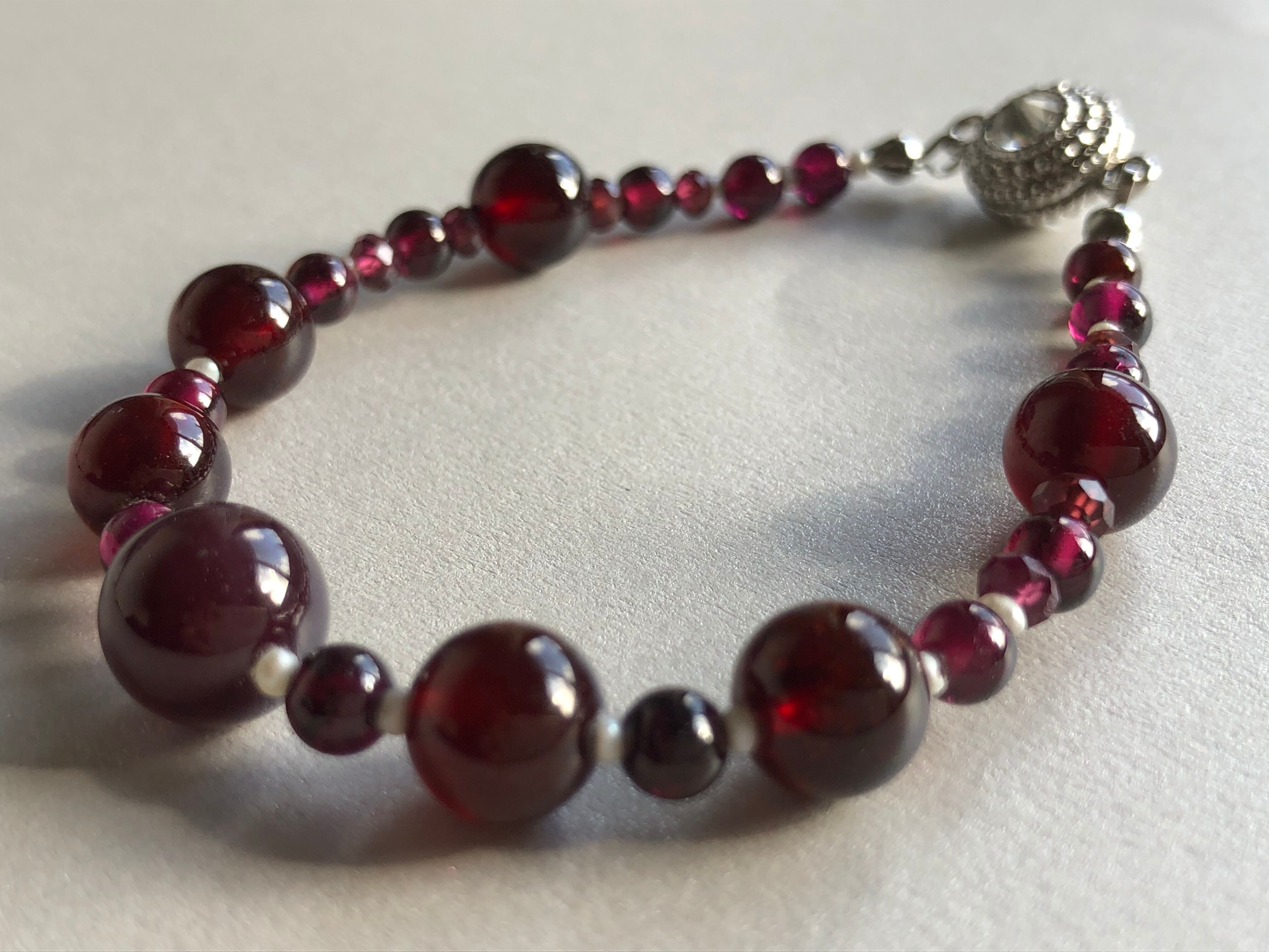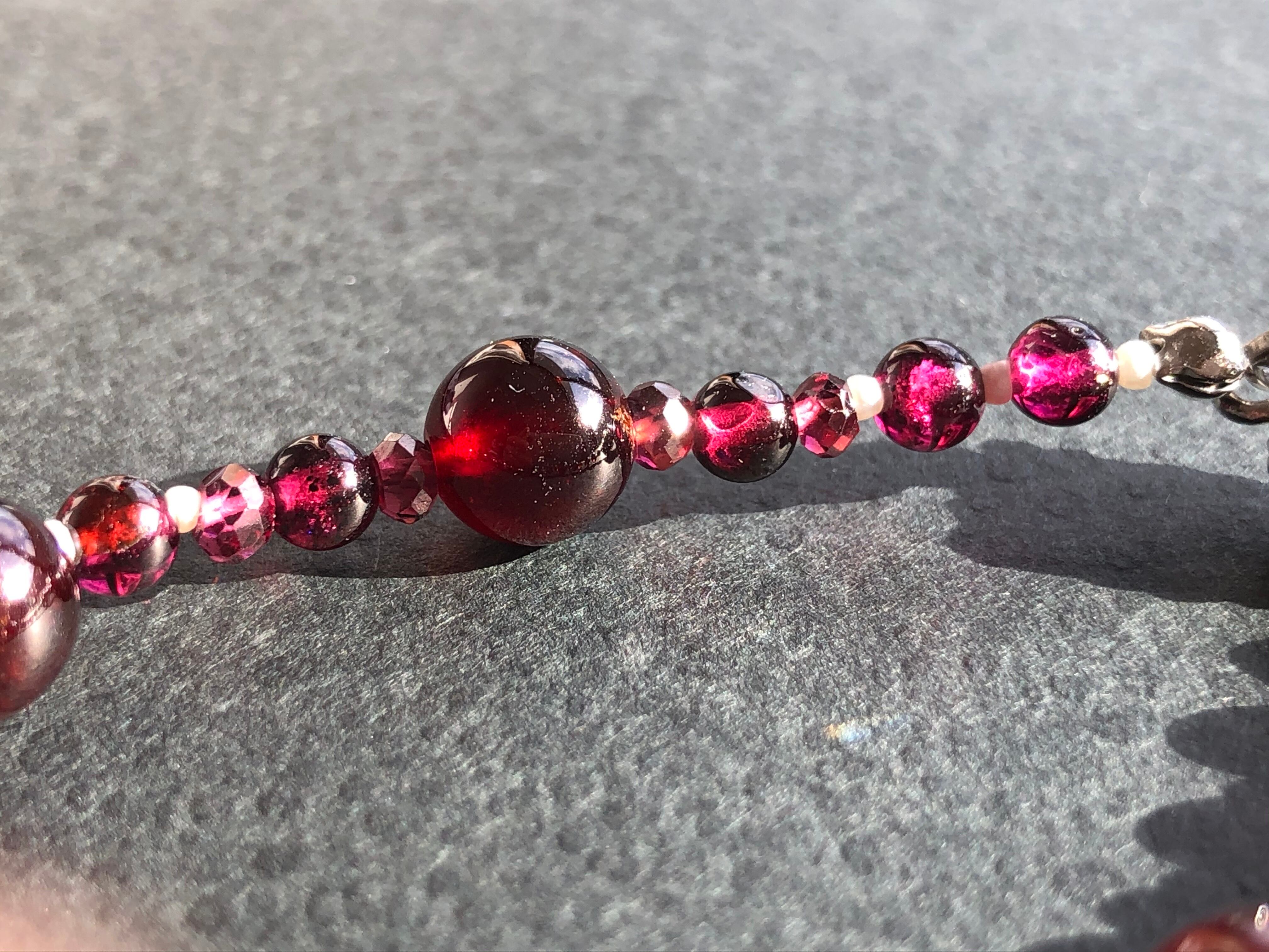 高品質なガーネットと極小の淡水パールでつなぎました
