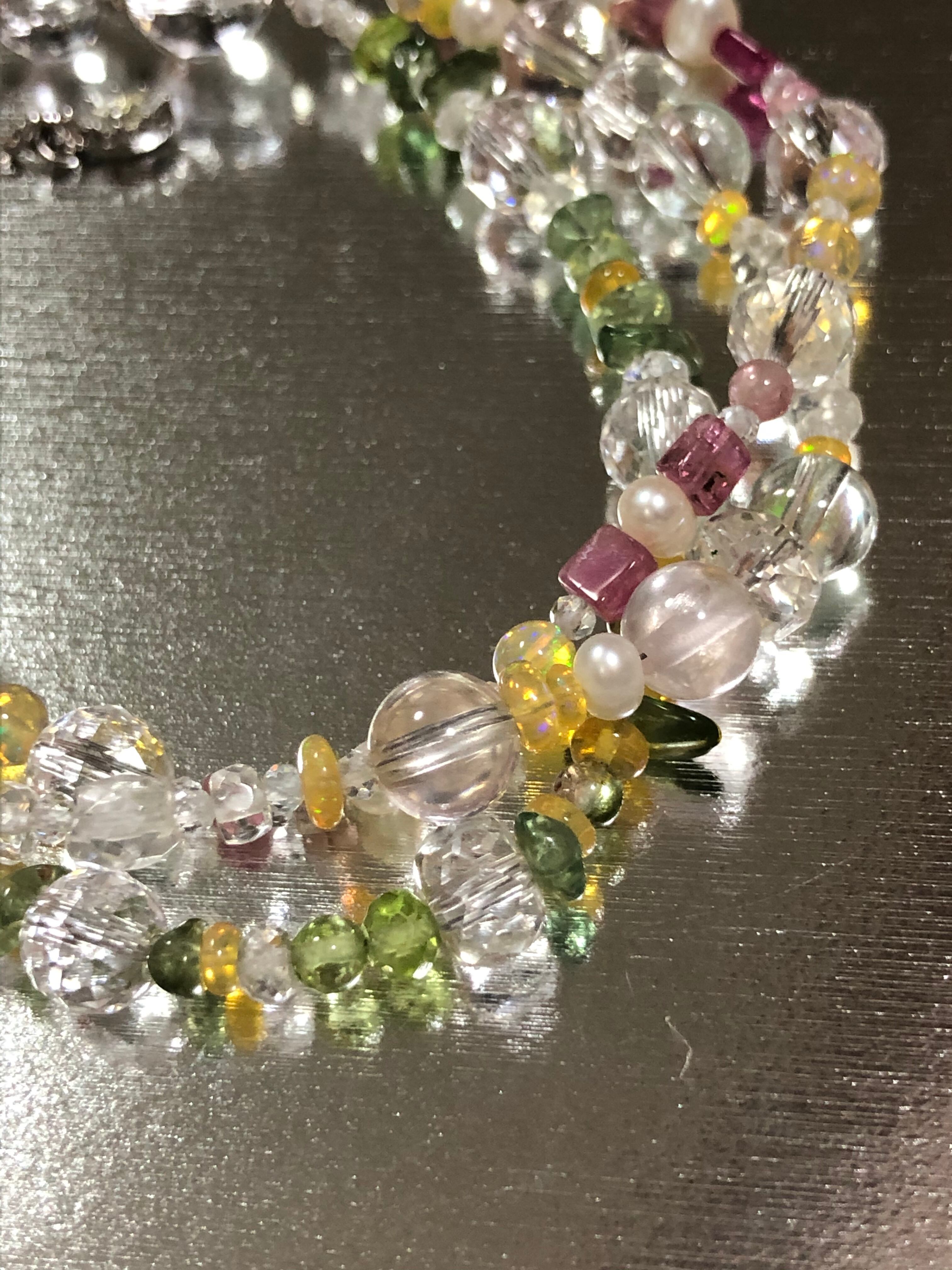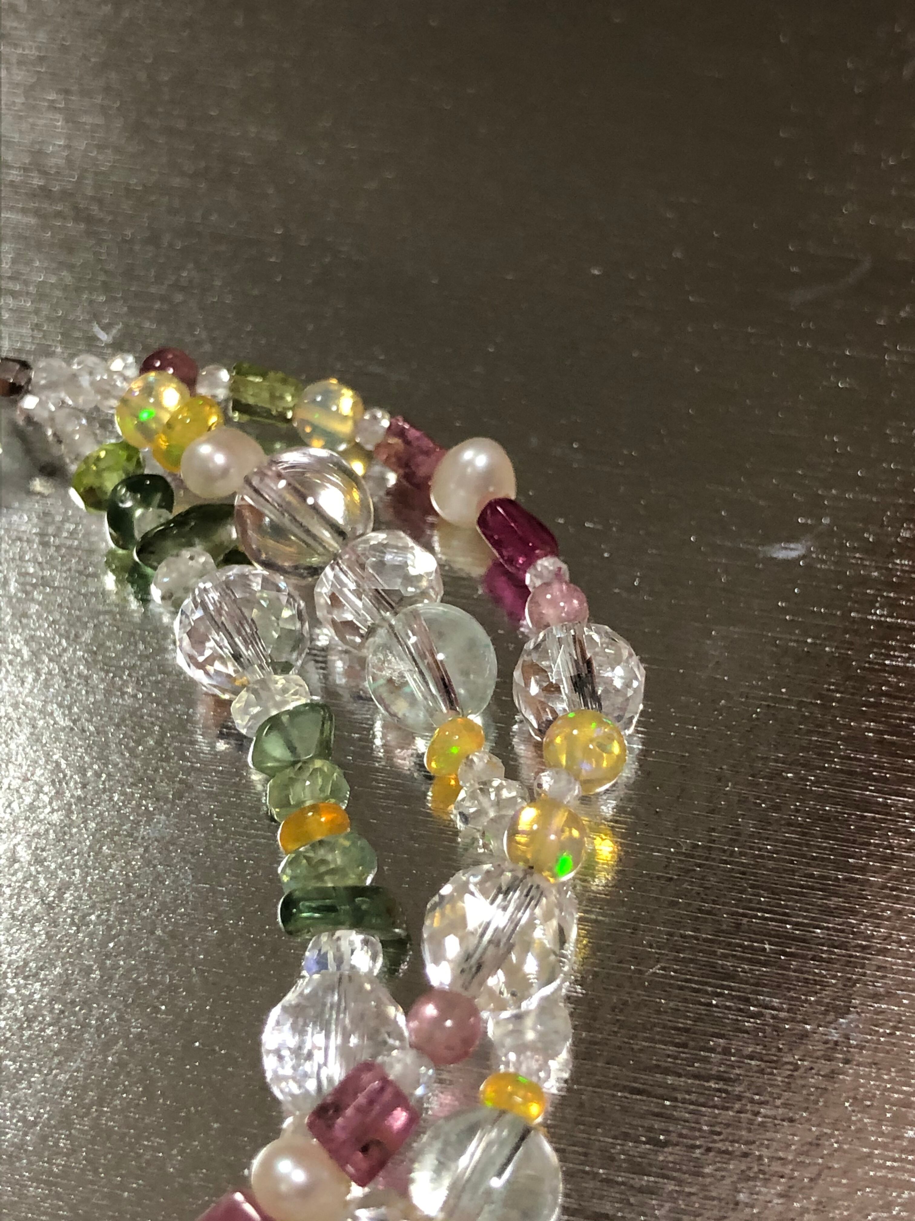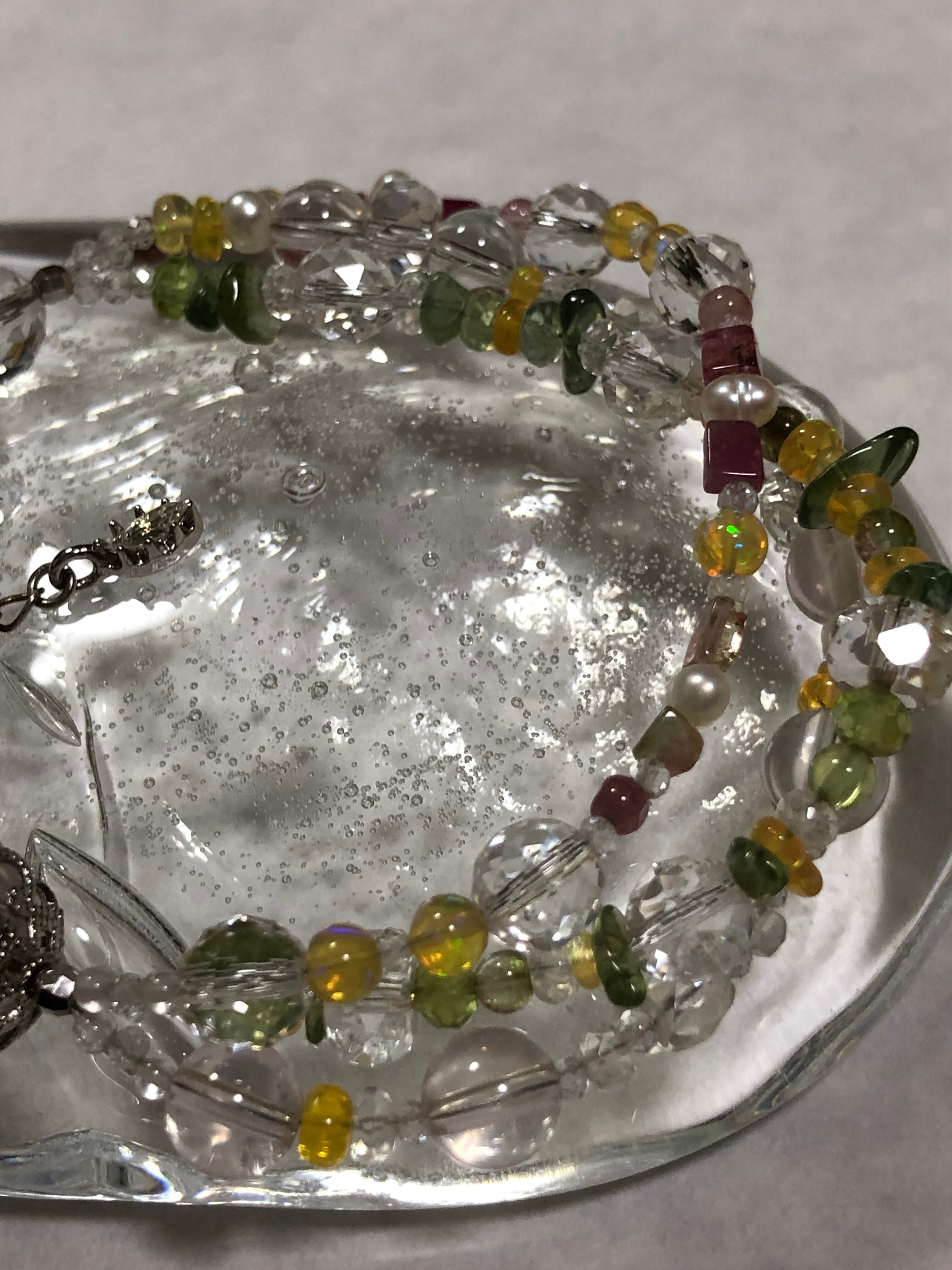rose quartz &clear topaz & tourmaline(pink.green) & peridot & peristerite & opal & pearl & rock crystal